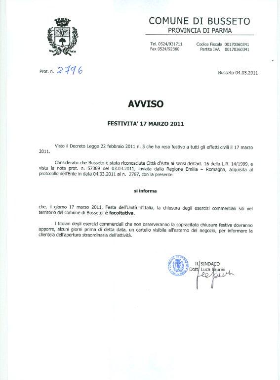 Avviso per esercizi commerciali - 17 Marzo 2011 - Festa Unita d'Italia