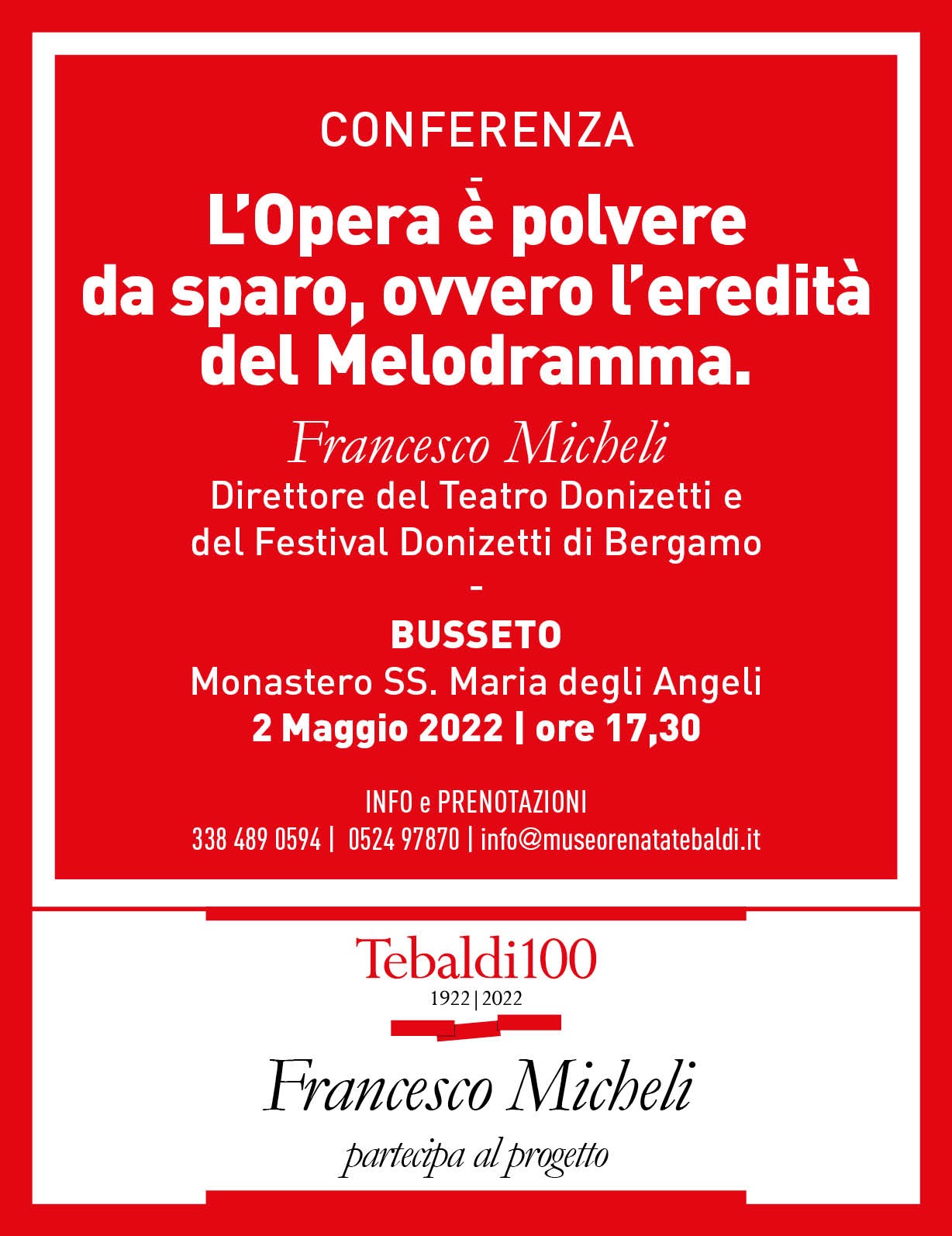 Francesco Micheli sarà poi ospite della Fondazione Renata Tebaldi Museo presso il Monastero di Santa Maria degli Angeli a Busseto alle ore 17,30. Ingresso libero.