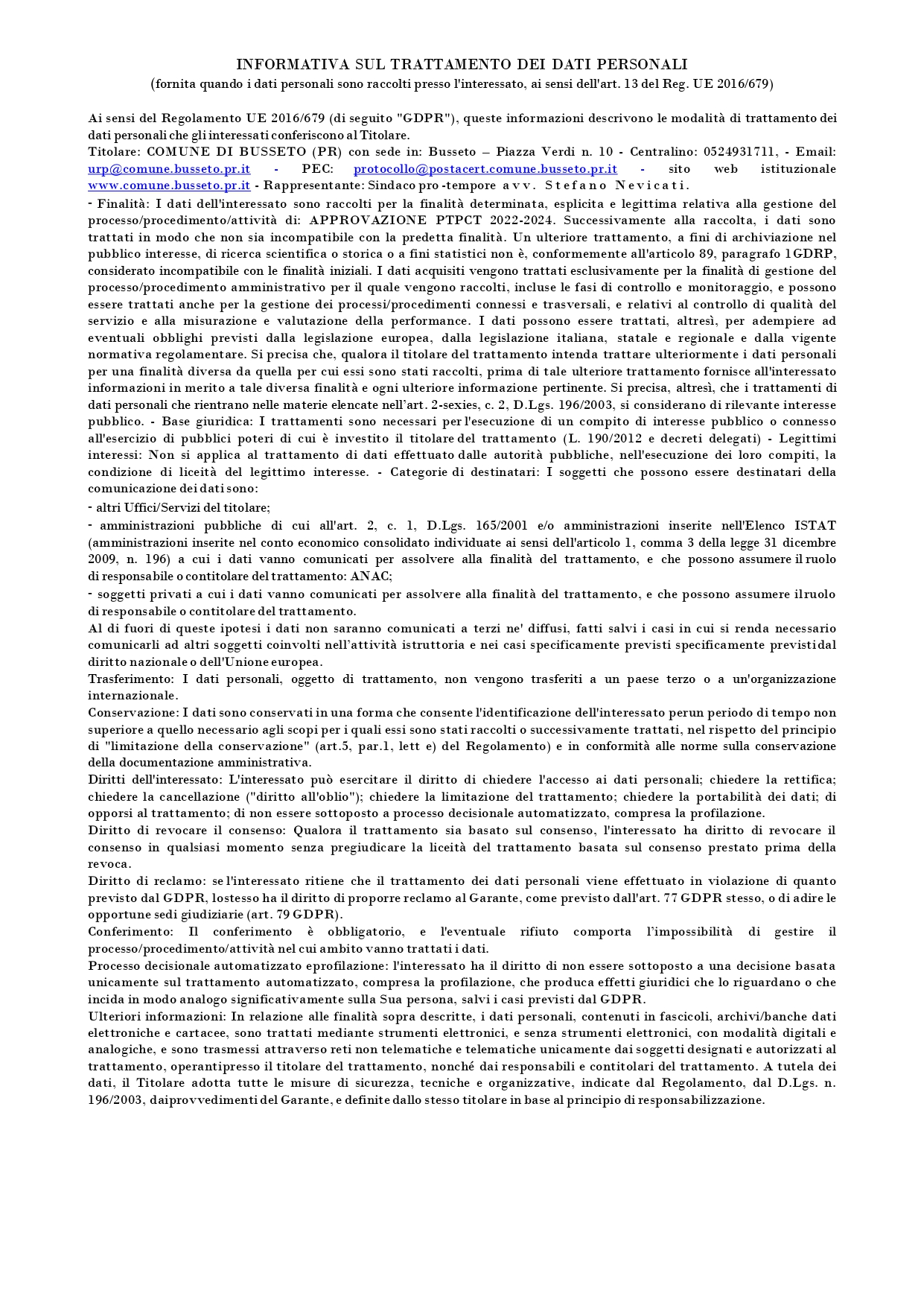 Il Responsabile della prevenzione della corruzione e della trasparenza, Segretario dott. Giuseppe D’Urso Pignataro, evidenzia a tal fine che il Piano Triennale di Prevenzione della Corruzione e della Trasparenza 2021/2023 è consultabile sul sito internet dell’Ente www.comune.busseto.pr.it nella sezione Amministrazione Trasparente, sottosezione “Disposizioni generali/Piano triennale per la prevenzione della corruzione e della trasparenza” raggiungibile al seguente link: https://busseto.trasparenza-valutazione-merito.it/web/trasparenza/traspa...