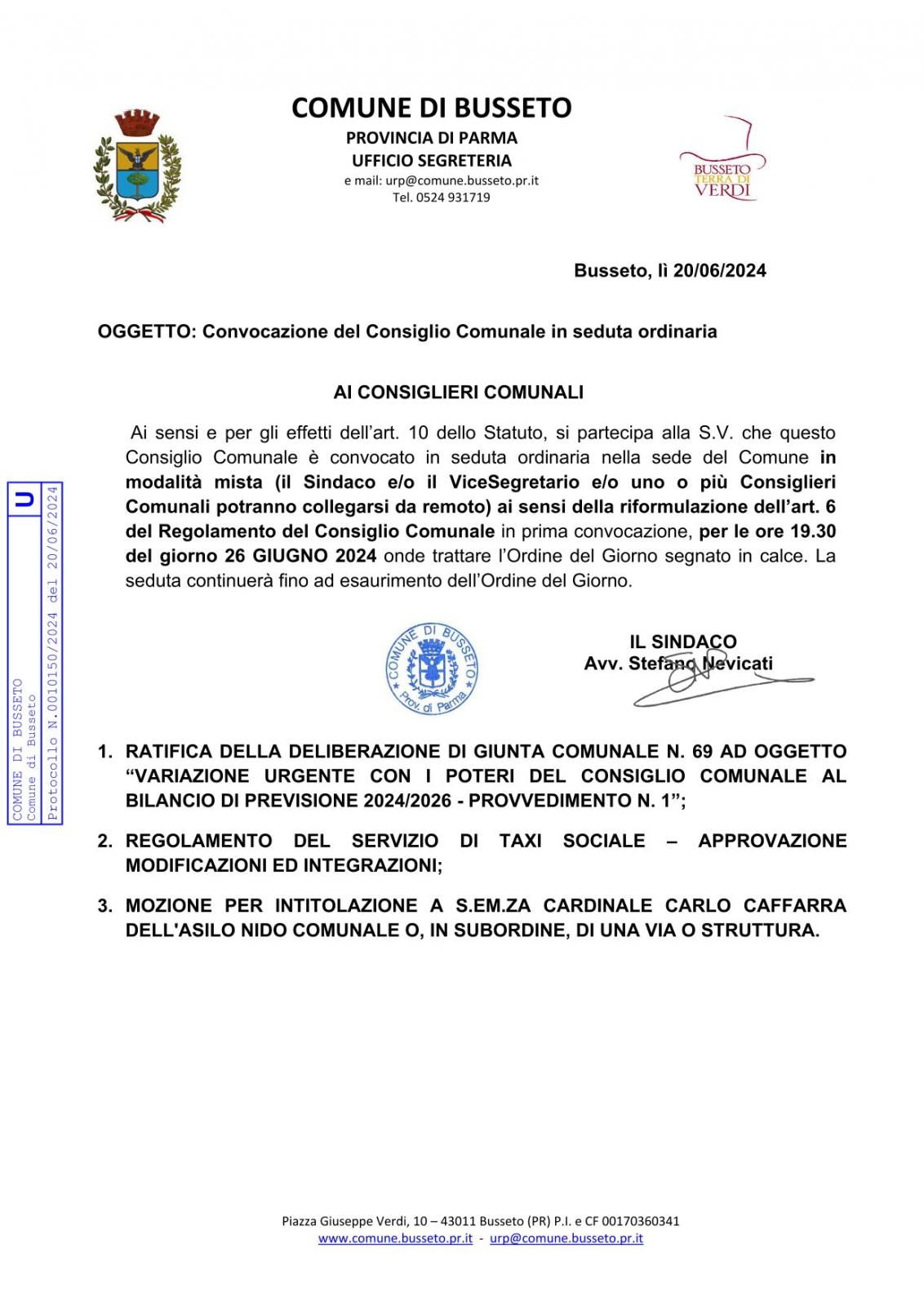 Convocazione del Consiglio Comunale in seduta ordinaria